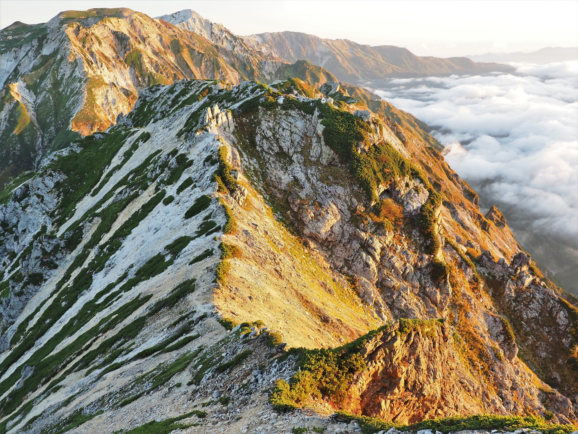 白馬岳から雲海に浮かぶ剱・立山連峰・黒部峡谷の景観を眺めながら不帰(かえらず)キレットの難所を越え、唐松岳へと歩くダイナミックな縦走です。