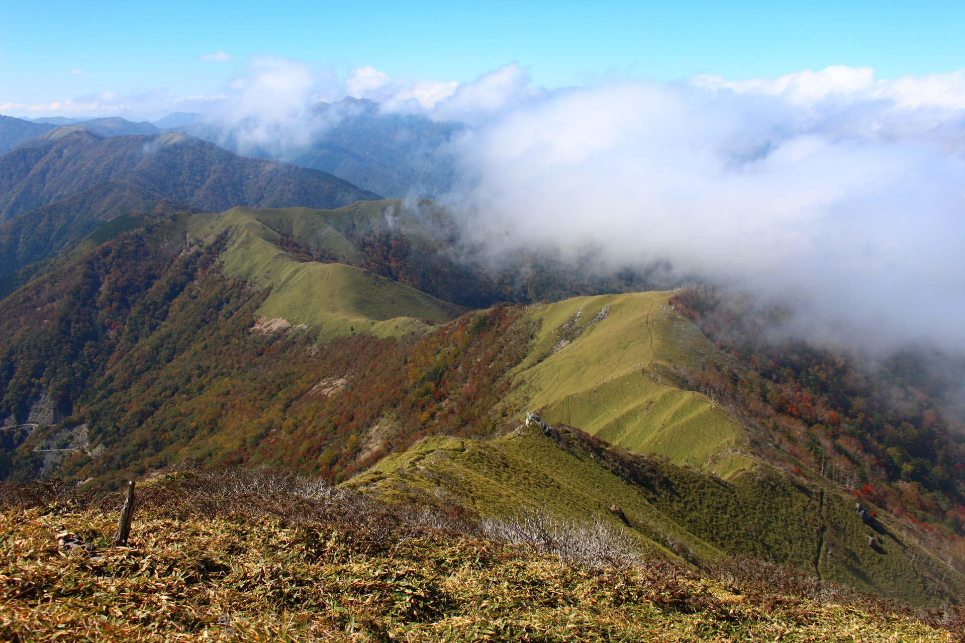 笹原が広がる開放的な稜線、紅葉、そしてスリリングな岩場を楽しめる四国屈指のロングトレイルです。